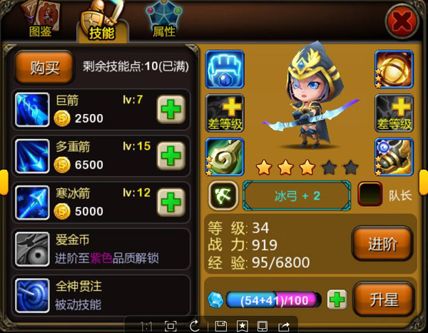 冰弓: 2和3技能必须跟上人物等级,到紫卡在点1技能。紫卡技能暂时不用点,如果缺金币玩家可以点。