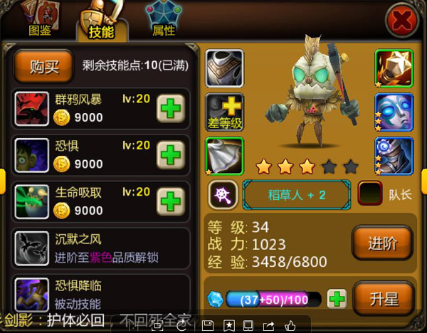 稻草人:1和3技能必须跟上人物等级,点满了可以点2能,到紫卡就点4技能