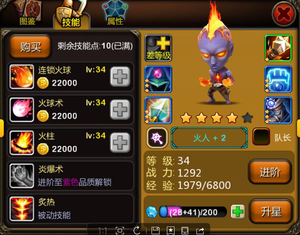 火人: 1和3技能必须跟上人物等级,点满了可以点2能,到紫卡就点4技能