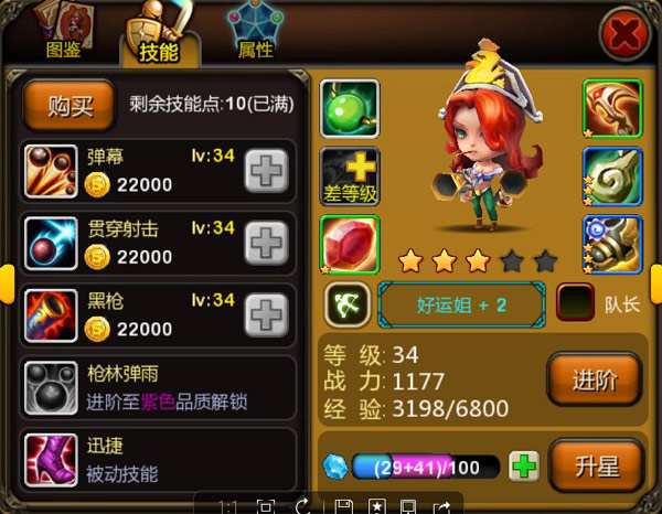 光女: 1和2技能必须跟上人物等级,点满了可以点3技能,到紫卡点4技能