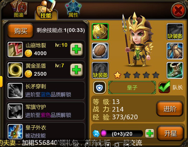 皇子: 2和3技能必须跟上人物等级,1技能和人物等级相差5点就行。到紫卡在点紫卡技能。