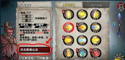 心法的装备点击红圈内的按钮就可以打开心法界面选择心法装备。