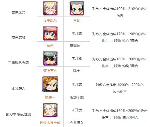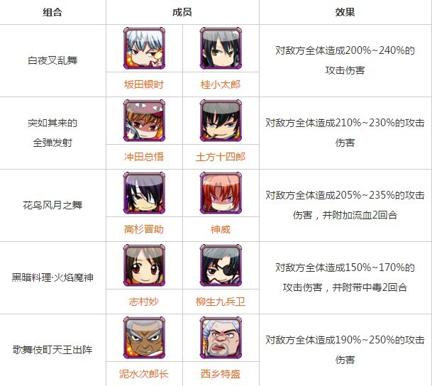 合体技是《银魂》卡牌对战中的特色之一,一些特殊伙伴组合同时在场上时有一定几率触发合体技能,可以给对手带来成吨的伤害,可以说是队伍的压箱底啦。触发合体技能的条件有: