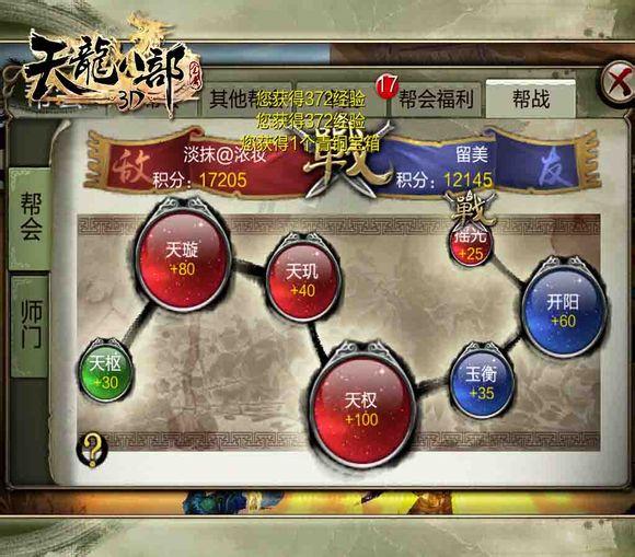 3、每个胜利的队伍能获得10点帮战积分和3点帮贡,失败方无积分,有1点帮贡