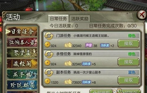 每天玩家可接取30环日常任务,每次任务内容随机出现,杀怪、拜访、寻物等类型带你了解武林深邃,持枪扶弱的侠客之旅完美呈现在游戏活动中。同时每次完成日常任务可以得到大量金钱、经验、活跃度等奖励。
