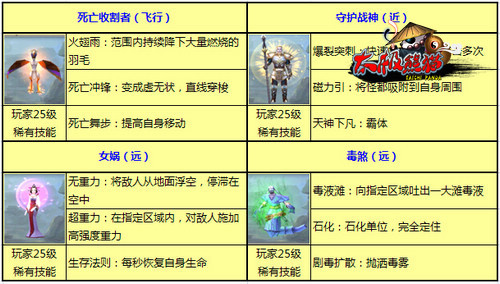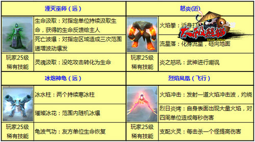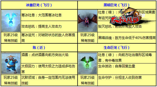 巨龙系列有冰霜、黑暗、生命等等,他们的技能相当强大,两个普通技能分别为范围进攻“吐息”、辅助技能“怒吼”,,当玩家到达25级时,推荐黑暗巨龙的黑暗战魂:敌方生命低于40%时伤害提高,打BOSS的时候绝对管用!