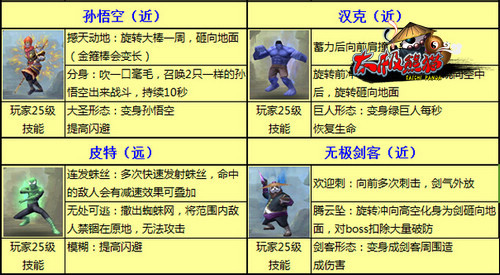 新版本中将会出现的全新武神哟!他们技能犀利,甚至还可以让玩家进行变身。如孙悟空的稀有技能“大圣形态”,可以让玩家化身为孙悟空,提高闪避值,同时还能使用武神自身技能,分身召唤2只小悟空,一起撼天动地,猛砸金箍棒吧!