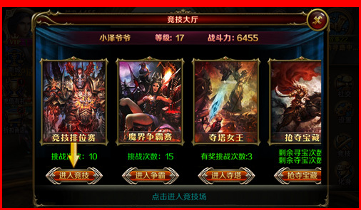 玩家等级达到15级时候就可以下很多副本的了,这时候建议玩家多下副本,多得金币用来强化装备。等级达到 17级就可以开启竞技排位赛、魔界争霸、夺塔女王和抢夺宝藏了。通过竞技排位赛等玩法,玩家也可以得到数额不菲的金币和经验以及稀有道具碎片。