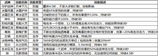 武神稀有技不但能提高武神自身战斗力,还能给玩家增加强力的辅助属性。同样其分类繁多:防御、攻击、生存、控制等等,如下统计一张现有武神稀有技的表格,仅供大家参考。