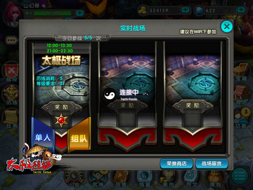《太极熊猫》实时战场开放时间分别是中午和晚上的黄金时间,考虑到玩家的游戏碎片时间,这样这样方便玩家能够迅速地组到机友,展开大战。玩家们角色等级达到25级时,在战场开放时间里通过点击“历练”到“实时战场”就可以转入实时战场界面了。战场下方有两个按钮,可以进行单人匹配和组队匹配。游戏目前开放了一个战场地图--【太极战场】,该战场地图较大,视野开阔,玩家可以尽情地组合作战方法,秀出个人的风采和团队的自信!
