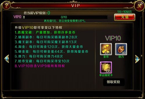 更高级的VIP包含低级VIP拥有的所有功能,同时一些和次数有关的功能都会逐渐增加次数。为了不重复,接下来只说一下每一级VIP都会新增些什么功能吧。
