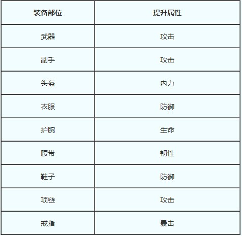 不同部位的装备,升星后加成的属性也不尽相同,详见下列表格:
