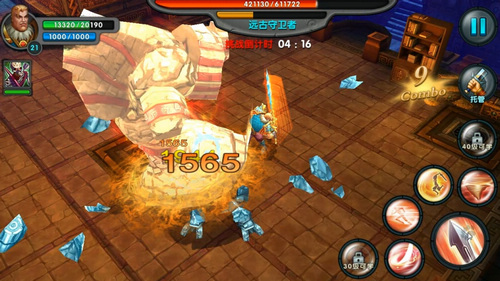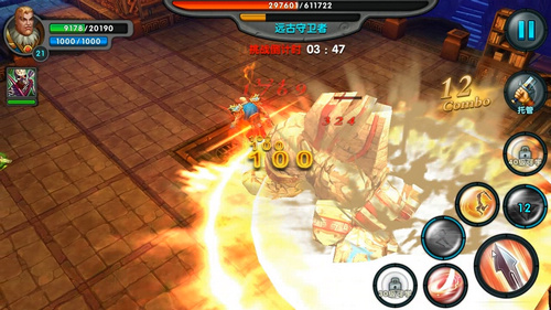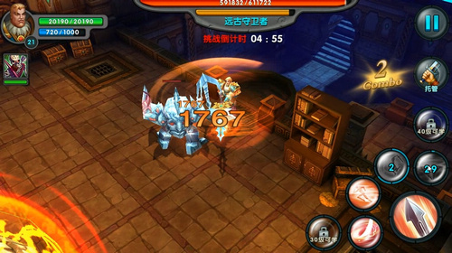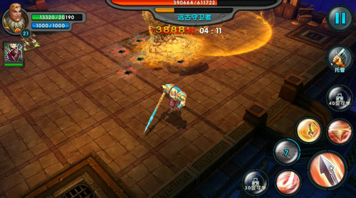 BOSS出生后释放一个元气弹的大招,同时会在BOSS的右侧和左侧分别召唤两个石像。这时不要急着攻击BOSS,由于先前的走位,武神处于安全距离不会被攻击到,目前所要做的是迅速移动向BOSS右侧,优先击杀上图所示的冰冻石像。