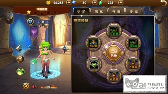 在游戏中,每个英雄将根据自身特性,会需求6件不同的装备。玩家可通过系统提示在战役副本中获得指定的英雄装备,为英雄穿戴后便可获得相应的属性加成。当玩家为英雄穿戴齐6件装备时,就可以为英雄进阶啦。进阶后,英雄会获得额外的属性加成,同时开启新的装备需求。另外,在随着英雄的进阶,还将解锁获得神秘的技能!