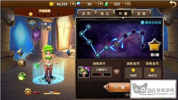 在游戏中,英雄的每个星级都有10个星宫,收集少量的英雄碎片即可点亮一个星宫,同时获得属性加成。当玩家点亮10个星宫后,英雄将自动升到下一星级,并额外获得大量的属性加成。升星所需要的英雄碎片可通过精英副本、神谕之城许愿、竞技场和超神之路对应的商店等途径轻松获得。