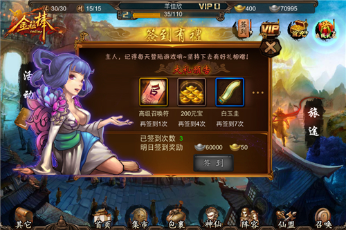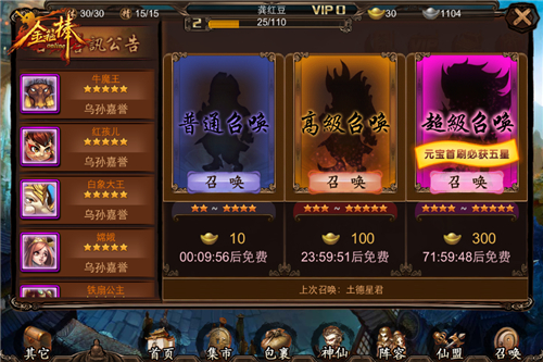 通过签到、升级、完成新手天书任务积累元宝,到6级左右时可存够元宝进行超级召唤的元宝首抽,必定获得五星神仙,大大增强阵容实力。相信很多玩家的第一个五星神仙都来自元宝首抽哦!
