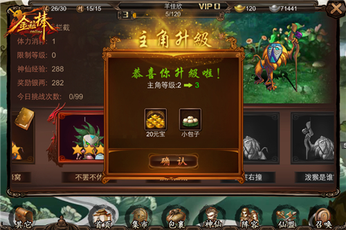 《金箍棒OL》中,等级有神仙等级和主角等级2种。升级的主要途径:旅途、封神榜和渡劫,这些活动都会消耗你的体力和精力。
