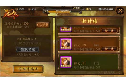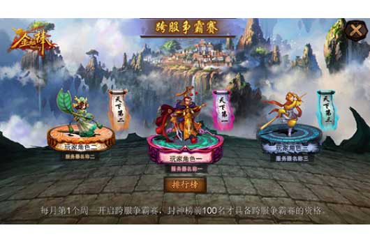 每月第一个周一为跨服争霸赛的固定开启日期。跨服争霸赛的入口位于封神榜界面的左下角,每个服封神榜前100名的玩家可参与。跨服赛开始后,将根据相应的规则将若干个不同服务器的玩家划分至一个战区内,根据战斗实力匹配可挑战的对手,进行王者间的PK对决。