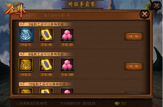 跨服擂台中必然会有这样的高手,捷报连连、战无不胜!当玩家在跨服赛中连胜达到一定的次数,不仅会有全服的走马灯昭告天下,更有珍贵的奖励:元宝、蟠桃、银绸乾坤袋、金丝乾坤袋、乾坤符箓等。连胜越多,奖励越丰厚。