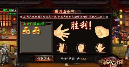 《格斗江湖》是一个刀光剑影的武侠世界,但谁说大侠只能打打杀杀,我偏要开家客栈逍遥武林!然而开客栈也未必轻松,除了每天要引客人入住、牵马喂食、打扫客房以外,时不时还要给客人提供特殊服务,比如这位客官,居然要求和老板我玩石头剪子布!好吧,其实平时照顾客栈也没有多少收入,但猜拳的利润可是翻倍的,就算输了也只是按当前收入的一半返还给你,总之稳赚不赔,对照剪刀石头布致胜策略,看是否能赚个盆满钵满!