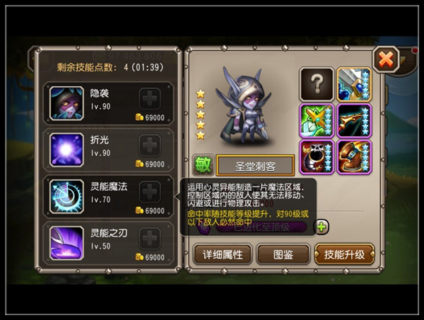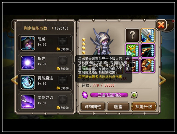 折光(普通):每当圣堂刺客杀死一个敌人后,她将获得5层折光护盾。每层折光可以抵挡一次攻击,并为圣堂刺客回复80点能量。在折光的保护下,圣堂刺客免疫所有控制效果。