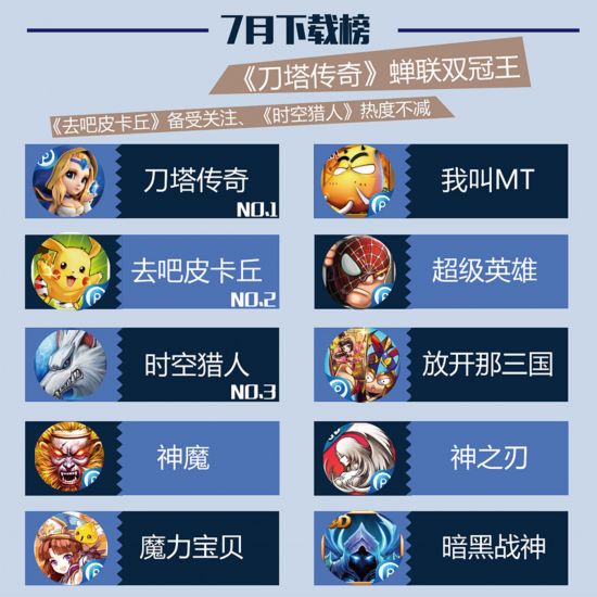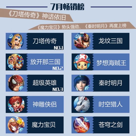 随着国产3D动漫大作《秦时明月》游戏同名电影的推广热,PP用户对《秦时明月》的关注也越发提高,用户数提升明显,各项数据均提升明显,因为7月优秀游戏数量众多,所以再次出现在榜单之上。
