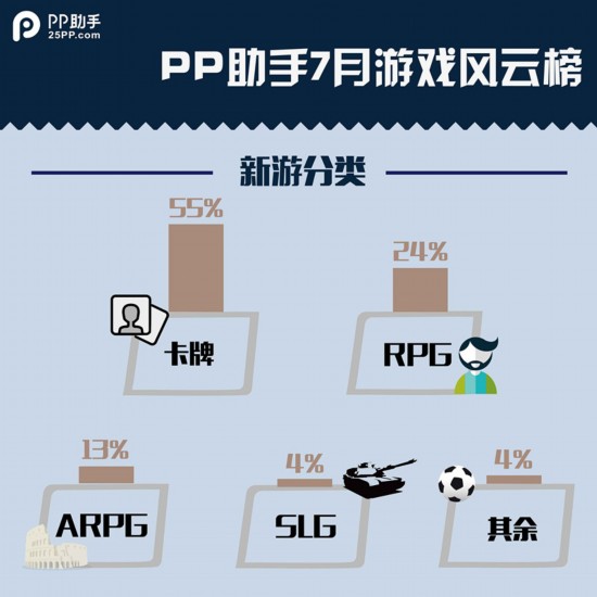 PP助手今天发布七月手游报告,7月PP助手上线新游共计68款,其中卡牌37款,RPG有16款,ARPG9款,SLG3款,其余类型3款。其中卡牌类游戏占比仍然最高,达到了55%,与上月基本持平。而在单品收入排行上,与上月对比变化不大,《刀塔传奇》、《放开那三国》、《超级英雄》三款游戏依旧霸占收入前三的位置。