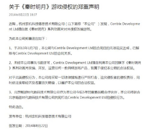 玄机科技上周五在其《秦时明月》官方微博发布了《关于<秦时明月>游戏侵权的郑重声明》。声明中称,Centrix Development Ltd(文中简称“Centrix公司”)擅自就《秦时明月》系列动画片对外授权改编游戏,玄机科技将联合重要战略合作伙伴畅游共同打击Centrix公司的侵权行为。对此畅游方面表示,将会积极配合玄机科技,严厉打击盗版,维护行业秩序。