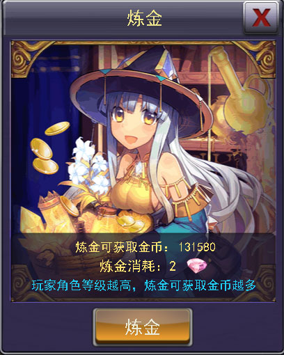 炼金是玩家最直接最快捷获取大量金币的手段,玩家等级越高,每次炼金获得金币的数量也越多;每日玩家可以有定量的免费炼金次数,VIP等级越高,免费次数越多;.也可以使用魔晶来购买额外的炼金次数