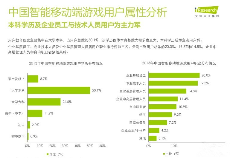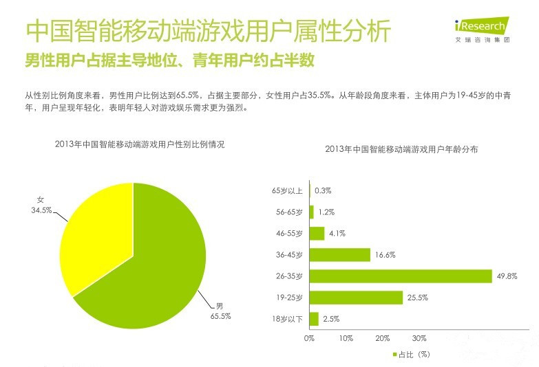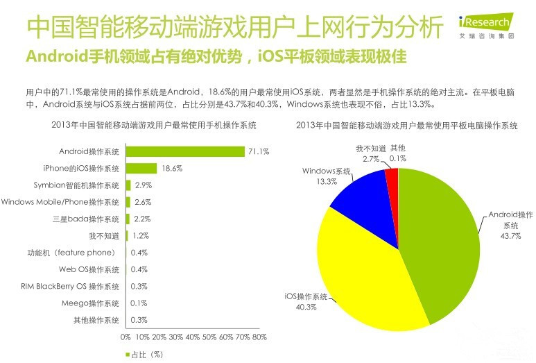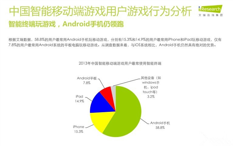 近日,艾瑞咨询发布《2014年中国智能移动端游戏用户行为研究报告简版》。报告由中国智能移动端游戏用户属性分析、用户上网行为分析、用户游戏行为分析等三部分组成。数据显示,使用只能移动端游戏用户男性用户占据主导地位,青年用户约占一半,其中中等收入用户居多。手机和平板电脑是用户使用的主要移动设备,Android手机领域占有绝对优势,iOS平板领域表现极佳,超六成用户上网频繁,平板电脑用户主要用WIFI上网,碎片化时间被用户充分利用。