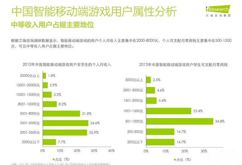 数据显示:智能移动端游戏的用户个人月收入主要集中在2000-8000元,个人可支配月零用钱主要集中在500-1500元,可见中等收入用户占据主要地位。