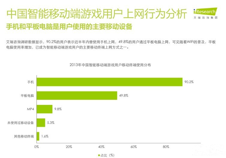 数据显示,90.2%的用户表示近半年内曾使用手机上网,49.8%的用户通过平板电脑上网,可见随着WIFI的普及,平板电脑使用率增加,已成为智能移动端游戏用户的主要移动终端上网方式之一。