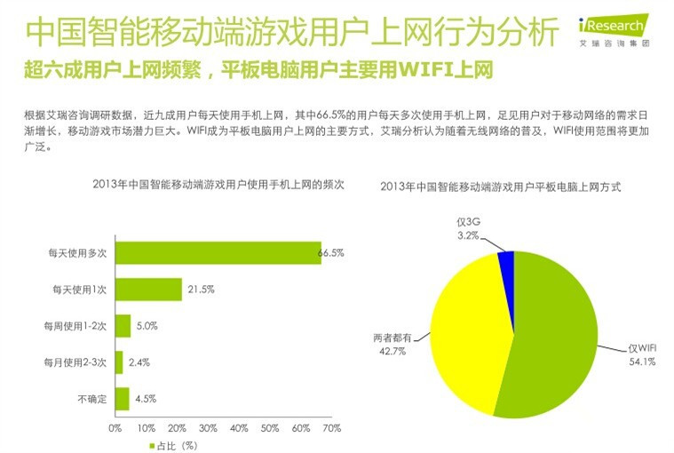 数据显示:近九成用户每天使用手机上网,其中66.5%的用户每天多次使用手机上网,足见用户对于移动网络的需求日渐增长,移动游戏市场潜力巨大。WIFI成为平板电脑用户上网的主要方式,艾瑞分析认为随着无线网络的普及,WIFI使用范围将更加广泛。