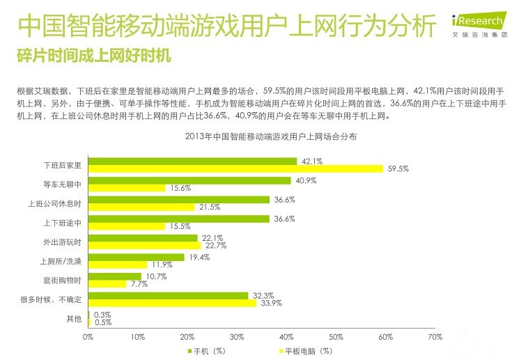 数据显示:下班后在家里是智能移动端用户上网最多的场合,59.5%的用户该时间段用平板电脑上网,42.1%用户该时间段用手机上网,另外,由于便携、可单手操作等性能,手机成为智能移动端用户在碎片化时间上网的首选,36.6%的用户在上下班途中用手机上网,在上班公司休息时用手机上网的用户占比36.6%,40.9%的用户会在等车无聊中用手机上网。