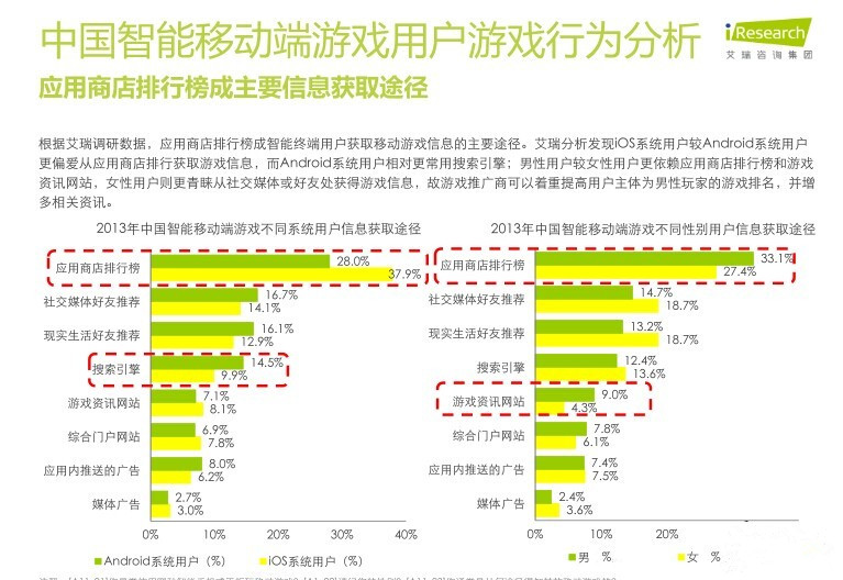 数据显示:应用商店排行榜成智能终端用户获取移动游戏信息的主要途径。艾瑞分析发现iOS系统用户较Android系统用户更偏爱从应用商店排行获取游戏信息,而Android系统用户相对更常用搜索引擎;男性用户较女性用户更依赖应用商店排行榜和游戏资讯网站,女性用户则更青睐从社交媒体或好友处获得游戏信息,故游戏推广商可以着重提高用户主体为男性玩家的游戏排名,并增多相关资讯。
