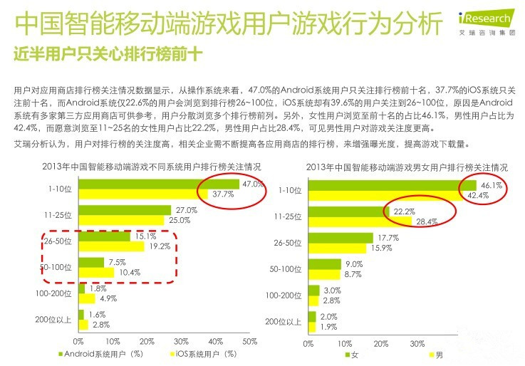 数据显示:用户对应用商店排行榜关注情况数据显示,从操作系统来看,47.0%的Android系统用户只关注排行榜前十名,37.7%的iOS系统只关注前十名,而Android系统仅22.6%的用户会浏览到排行榜26~100位,iOS系统却有39.6%的用户关注到26~100位,原因是Android系统有多家第三方应用商店可供参考,用户分散浏览多个排行榜前列。另外,女性用户浏览至前十名的占比46.1%,男性用户占比为42.4%,而愿意浏览至11~25名的女性用户占比22.2%,男性用户占比28.4%,可见男性用户对游戏关注度更高。因此认为,用户对排行榜的关注度高,相关企业需不断提高各应用商店的排行榜,来增强曝光度,提高游戏下载量。