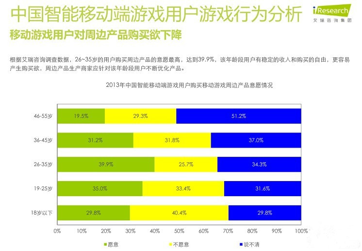 数据显示:26~35岁的用户购买周边产品的意愿最高,达到39.9%,该年龄段用户有稳定的收入和购买的自由,更容易产生购买欲,周边产品生产商家应针对该年龄段用户不断优化产品。