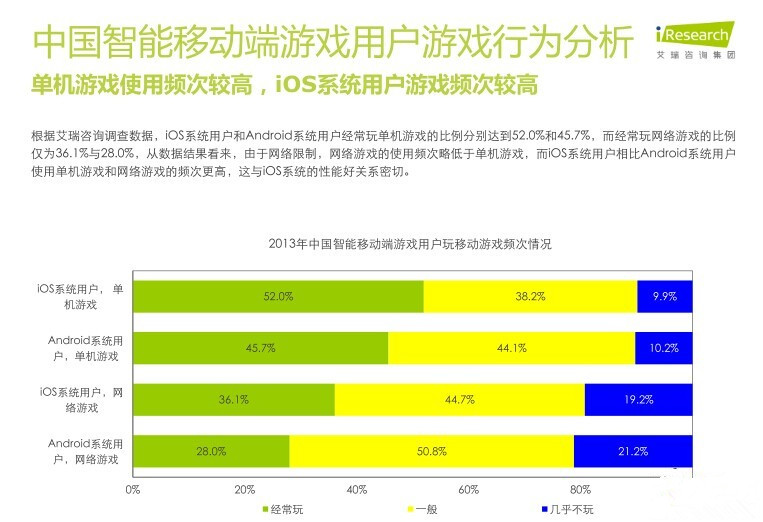 数据显示:iOS系统用户和Android系统用户经常玩单机游戏的比例分别达到52.0%和45.7%,而经常玩网络游戏的比例仅为36.1%与28.0%,从数据结果看来,由于网络限制,网络游戏的使用频次略低于单机游戏,而iOS系统用户相比Android系统用户使用单机游戏和网络游戏的频次更高,这与iOS系统的性能好关系密切。