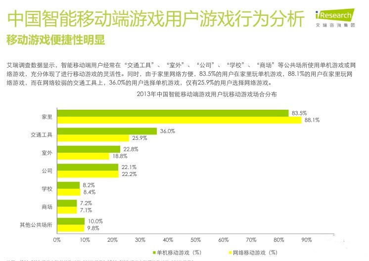 数据显示:智能移动端用户经常在“交通工具”、“室外”、“公司”、“学校”、“商场”等公共场所使用单机游戏或网络游戏,充分体现了进行移动游戏的灵活性。同时,由于家里网络方便,83.5%的用户在家里玩单机游戏,88.1%的用户在家里玩网络游戏,而在网络较弱的交通工具上,36.0%的用户选择单机游戏,仅有25.9%的用户选择网络游戏。