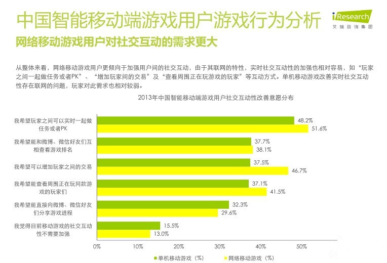 从整体来看,网络移动游戏用户更倾向于加强用户间的社交互动,由于其联网的特性,实时社交互动性的加强也相对容易,如“玩家之间一起做任务或者PK”、“增加玩家间的交易”及“查看周围正在玩游戏的玩家”等互动方式。单机移动游戏改善实时社交互动性存在联网的问题,玩家对此需求也相对较弱。