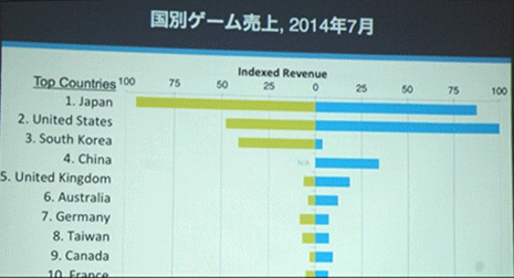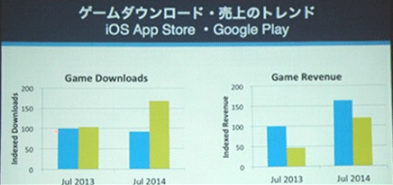 再来看看14年7月和13年7月的数据对比,以13年7月AppStore的数据为基准,我们可以看到游戏下载量方面AppStore出现了些许下降,而GooglePlay的增长率则超过了50%,一举超越AppStore。而在收入方面,虽然AppStore仍然领先于GooglePlay,但就增长率上来说,AppStore虽然超过了50%,但GooglePlay更是超过了100%。