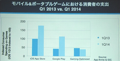 第一组数据是AppStore、GooglePlay、掌机三个领域2014年Q1和2013年Q1营收的对比。