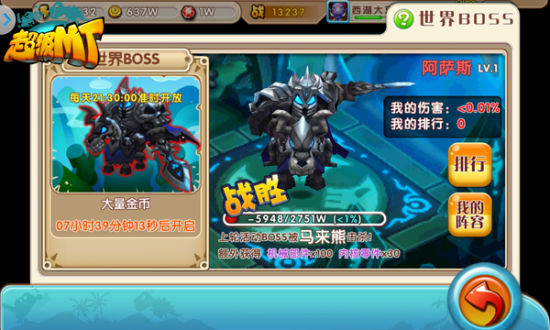 每个游戏中都会有一种NB的怪物叫世界BOSS,而《超级MT》中的世界BOSS就是大名鼎鼎的巫妖王阿尔萨斯了!每晚21:30,阿傻子来袭,不论胜败都可获得可观的金币奖励哦!世界BOSS副本全天开放,天天组团虐BOSS岂不快哉。