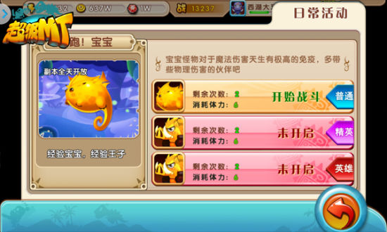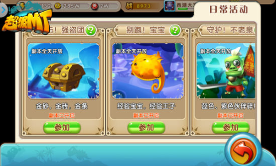 世界BOSS以上五个副本统统收纳在《超级MT》日常活动系统中,如果每天玩主线副本玩累了,没体力了,完全可以在日常活动中继续找到游戏乐趣,而且奖励更加丰富哦,赶紧叫上你的小伙伴们一起来《超级MT》中爽爽吧。
