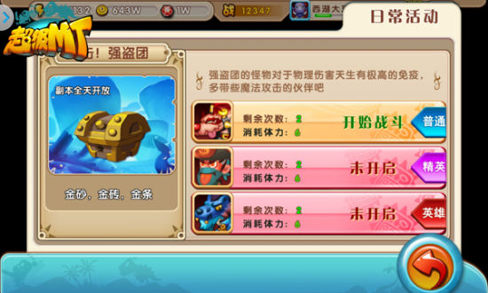 强盗团副本划分为普通、精英、英雄三个等级,与之相应的副本难度随之提升,不过奖励也会更加丰富。强盗团的怪物们对于物理伤害天生有着极高的免疫,因此进入该活动副本的玩家尽量配备全魔法攻击的伙伴阵容。普通级建议25级以上的玩家进行挑战,每次战斗获胜后可拿到大量金砂、金砖与金条,可谓是当之无愧的海岛宝藏。