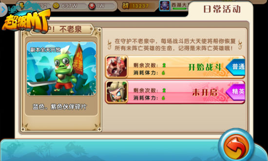 守护不老泉副本,是为玩家输出大量英雄碎片的地方,副本分为普通、精英两个级别,分别产出蓝色英雄碎片和紫色英雄碎片。而在守护不老泉中,每场战斗后都会出现一个美丽的大天使帮你的队伍恢复所有未阵亡英雄的生命,从而减小玩家攻克副本难度。副本每天每级别难度可分别挑战两回,战斗成功即可获得大量英雄碎片,每天不来打一把可是亏得很啊。