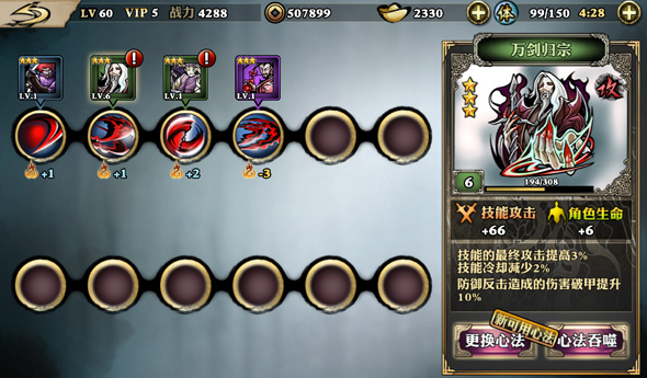 新的版本中,技能等级取消,2条连招链上不可再放置重复技能。心法不再百搭,而是和技能严格对应(每个技能可以装备3-4个不同的心法),让玩家在收集和培养时有明确的目标。“一键心法”的取消,还原了手动搭配的高策略性乐趣。另外,心法将可以由碎片拼凑,更近一步降低了心法的获取难度。