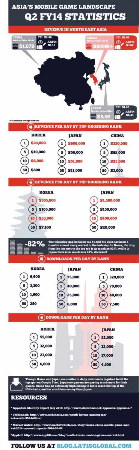 想知道中国、日本和韩国畅销移动游戏每天能赚多少钱吗?近日,专注于亚洲游戏市场研究的Latis Global对来自Tech in Asia、Market Watch及AppLift的多个机构数据进行汇总,编写了一份标题为《亚洲移动游戏全景:2014年Q2数据》的信息图。该信息图展示了中日韩三国移动游戏市场产值、每用户获取成本(CPI)、单次下载平均收益(ARPD)、顶级移动游戏每日收入等数据,非常值得一读。