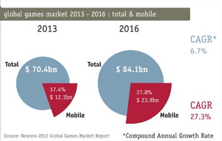 全球游戏市场2013年高达704亿美元,移动游戏占比17.4%,达123亿美元。而2016年,全球游戏市场收入有望达到841亿美元,移动游戏有望占比27.8%,或达239亿美元。游戏整体复合增长率将达6.7%,而移动游戏复合增长率将高达27.3%。