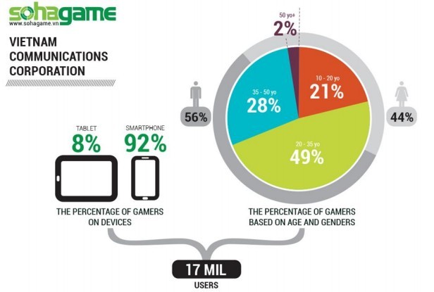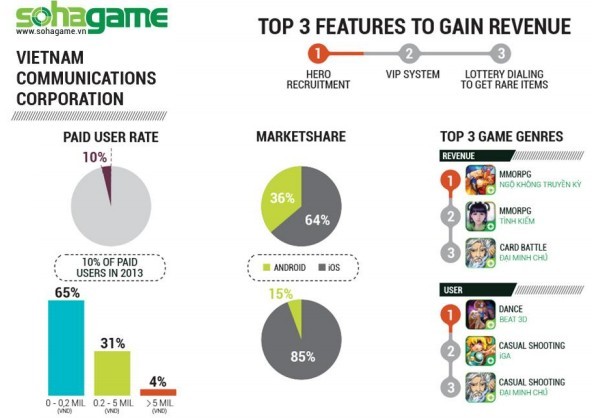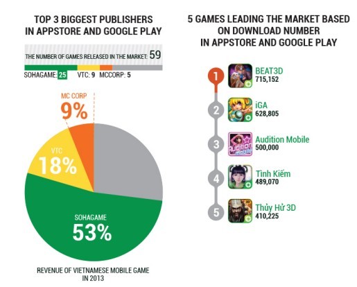 2013年GAMEX平台评选出越南最受玩家喜爱的游戏为《iGA》,该游戏的发行商为Sohagame。越南本地第一款为智能手机量身订制的手机游戏由Sohagame于2012年12月发行,在此之前,大多数的智能手机游戏都是简单移植于功能机。根据Appstore和GooglePlay综合下载量数据,排名前五的游戏分别是:《BEAT3D》《iGA》《Audition Mobile》《Tinh Kiếm》《Thùy Hư3D》。另外去年,越南本地游戏上架59款,就越南移动游戏收入而言Appstore和GooglePlay排名前三的越南发行分别是Sohagame(25款)、VTC(9款)以及MCCORP(5款)。市场份额如下: